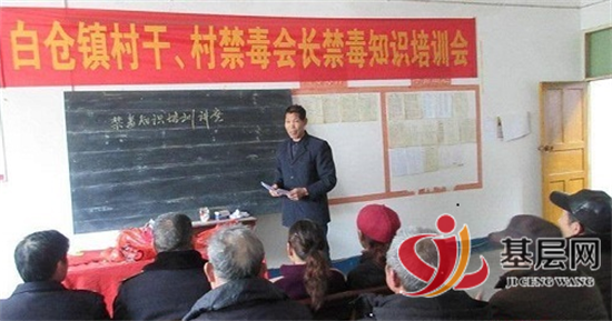 图为龙解元为村支两委干部、会员小组长上禁毒知识课