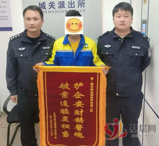 3月25日,加油站工作人员将一面写有“护企安财铸警魂 破案追赃显担当”的锦旗送到城关派出所,感谢民警为其排忧解难、挽回损失。
