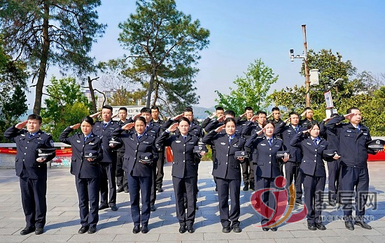 图为全体民辅警在革命烈士纪念碑前向英烈默哀致敬