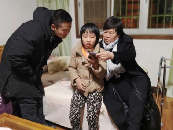 脑瘫患者张丽梅向项目组志愿者展示自己拍摄的短视频作品
