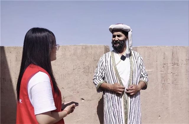 图1:“曜能智汇”社会实践志愿者曾晶正拿着问卷当地农户热合曼・麦麦提交流
