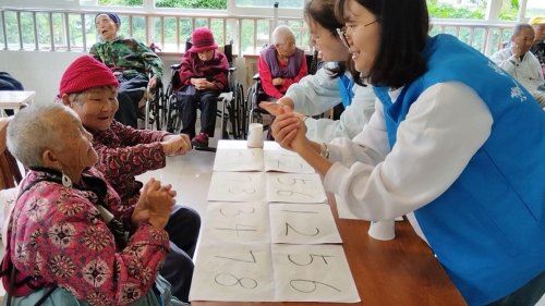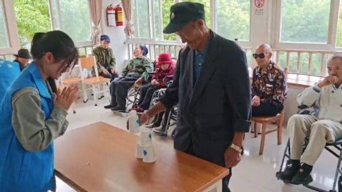 图为凌逾志愿团成员和老人一起玩纸杯套娃游戏。杨瑞 供图