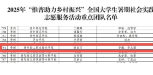贵州轻工职业技术学院的红星“黔”行实践队,一直以来积极投身于社会实践活动,曾在2024年荣获全国大学生暑期文化科技卫生“三下乡”社会实践活动“青春长征”专项活动中的“优秀实践团队”称号。今年,凭借其扎实的实践基础和突出的服务成效,该团队再次脱颖而出,成功入选2025年“推普助力乡村振兴”全国大学生暑期社会实践志愿服务活动重点团队。