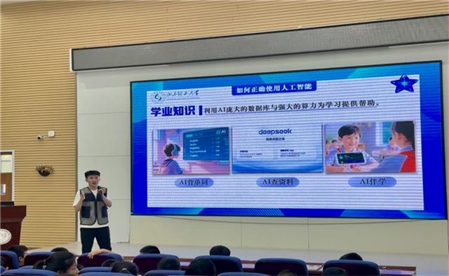 图为团队成员在该校对AI赋能教育知识进行宣讲