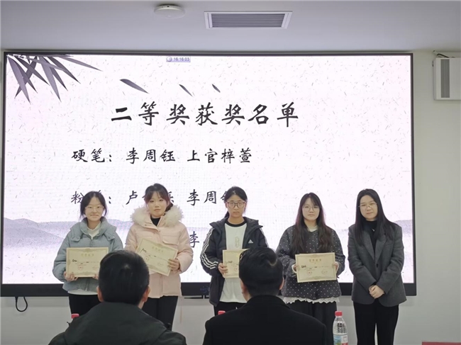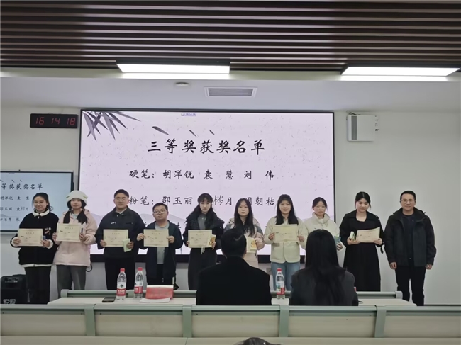 最终,大赛评选出各类别一、二、三等奖及优秀奖。其中粉笔字、毛笔字各设一等奖1名、二等奖2名、三等奖3名,硬笔字额外增设4名优秀奖,评委老师为获奖选手颁发荣誉证书与奖品。此次大赛不仅为学子搭建了展示才华的平台,更以笔墨为纽带传承中华文脉。未来,教育学院将持续推出特色文化活动,助力校园文化建设,让优秀传统文化在青年一代薪火相传。