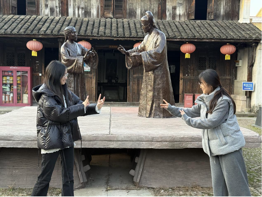 在越剧发源地甘霖镇东王村,探访组成员通过模仿创始人雕像姿态、实地观摩古戏台等方式,多角度感受越剧的起源脉络。团队成员还专门记录了古戏台的建筑特色和空间布局,为后续的数字复原工作积累了素材。越剧博物馆的参观让团队对越剧的现代化进程有了更深刻地认识。从早期的黑白影像到最新修复的4K版《梁祝》,技术的进步为传统艺术的保存和传播开辟了新途径。博物馆工作人员介绍:"数字修复不仅让经典剧目重焕光彩,更为研究者和爱好者提供了高质量的学习资料。"