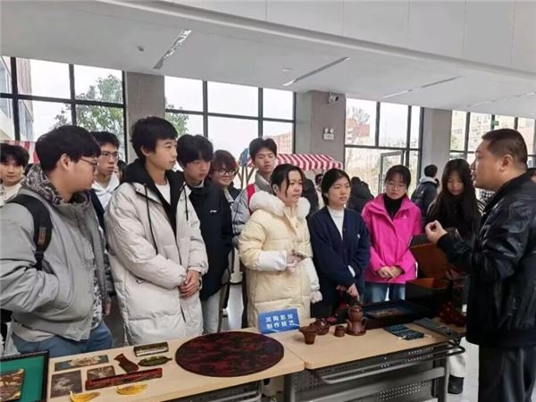 而在A区一楼大厅,各类非遗展品陈列其间,宛如一座小型的非遗艺术殿堂。精美的汉绣作品,丝线在绣布上交织出绚丽的图案,仿佛能让人看到绣娘指尖的灵动;造型别致的荆州漆器,色泽温润,纹理精美,承载着千年的工艺传承;静雅别致的插花,诉说着相隔千年的默契;还有那巧夺天工的木雕,一刀一凿都凝聚着匠人的心血与智慧。这些独特的民俗物件,吸引了众多同学和外国友人驻足观赏。