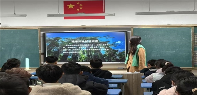 (图 1:大学生志愿者讲解海南热带雨林秘境奇观,台下学生瞪大双眼认真倾听)