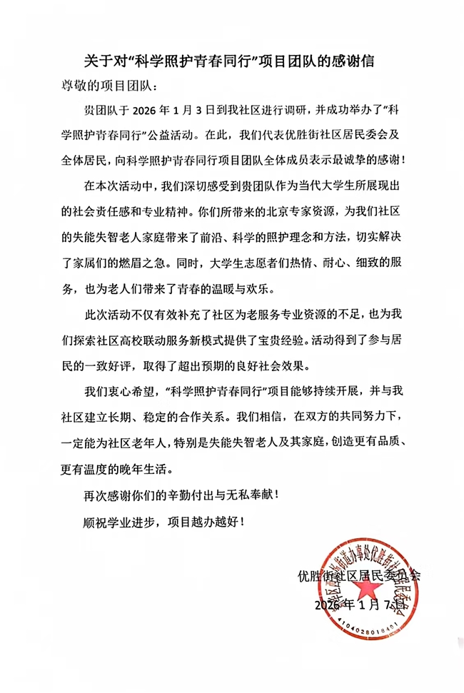 活动期间,护理学院“暖阳护康”团队收到优胜街社区致感谢信:“贵院师生以智慧平台赋能社区养老,用青春热情温暖银发群体,期待建立长效合作机制,让更多家庭享受‘喘息’之便。”据悉,护理学院已与多个社区签订共建协议,正式设立“暖阳护康”社区服务点,将定期开展学生轮训与护工复训服务。