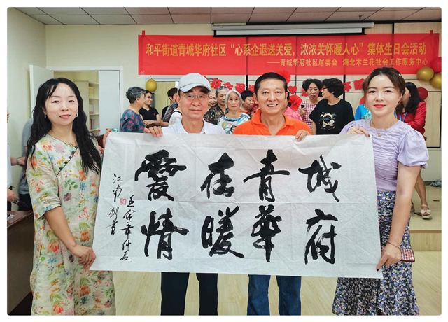 接着,青城华府社区东悦花欣艺术团带来了优美的舞蹈,得到大家阵阵掌声。小志愿者也上台表演,为生日会助兴。大家边品尝美味的蛋糕,边欣赏表演,其乐融融。最后,社区书法兴趣班的退休党员李忠红上台挥毫泼墨,用其精湛的书法功底写下“爱在青城,情暖华府”8个大字,寓意着青城华府社区是一个充满爱的温暖社区。企退人员王阿姨说:“没想到我们退休了,还能得到组织的关心关怀,我感到很开心很温暖。”