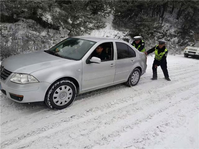 雪情就是命令,元月6日一大早,平顺县公安局交警大队的民警就纷纷出动,迎着寒风,冒着飞雪上路了。山腰间那条条玉带上,到处都是荧光黄,他们或铲雪除冰、或推车助困、或装链防滑、或抛洒溶剂,一个个忙的不亦乐乎。
