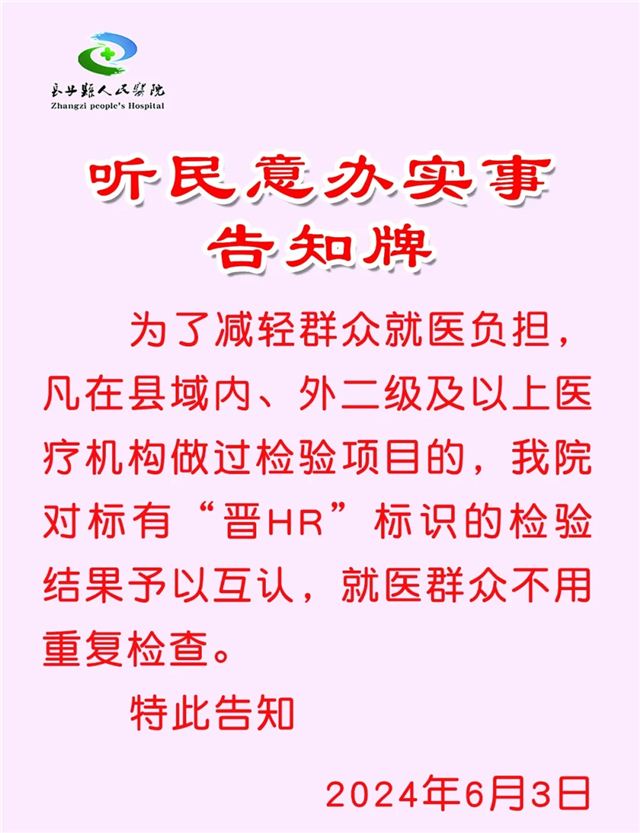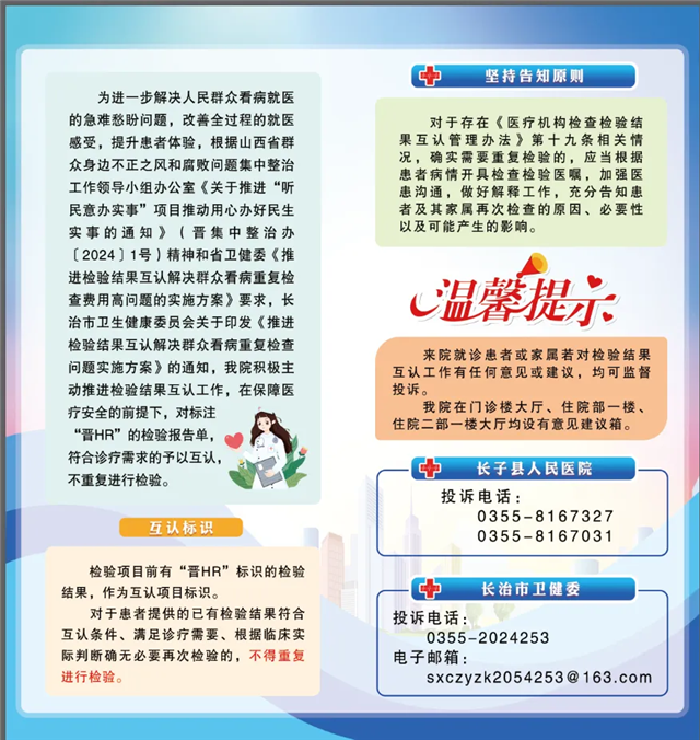 为进一步解决人民群众看病就医的急难愁盼问题,改善全过程的就医感受,提升患者体验,根据省市卫健委相关文件要求,长子县人民医院积极主动推进检验结果互认工作。在保障医疗安全的前提下,对标注“晋HR”的检验报告单,符合诊疗需求的予以互认,不重复进行检验。确实需要重复检验的,医务人员应当根据患者病情开具检查检验医嘱,加强医患沟通,做好解释工作,充分告知患者或其家属再次检查的原因、必要性以及可能产生的影响等。