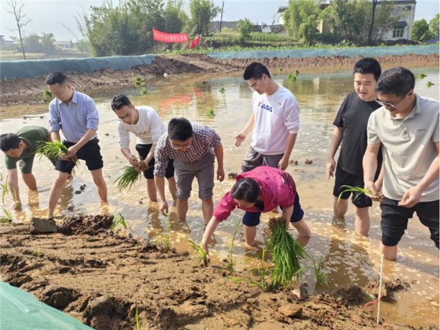 “左手分秧、右手插苗,行距保持25厘米,深浅要稳!”种粮大户梁庆忠深入田间,手把手传授插秧技巧。青年党员向述方初次下田,泥水没过膝盖仍埋头苦干:“一上午的劳作,真切体会到‘汗滴禾下土’的分量。但看到秧苗成行,老乡眉头舒展,一切都值了!”老党员罗安春一边擦拭额头的汗水一边感慨:“插秧看似简单,实则讲究技术又耗费体力。身在群众中,就要懂农事、知农情,才能真正服务好群众。”