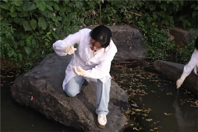图为实践团成员李荣荣在清溪河进行水质检测取样。彭晨 供图