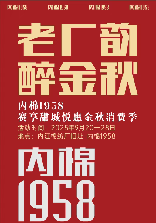 从“甜味+”产业展示到非遗体验,从日咖夜酒双模式到1958沉浸式游园,从厂景光影秀到啤酒达人赛——国企匠心打造,多元场景联动,带你穿越时空、品味甜城、畅享金秋!国企担当引领,惠民促消费实招频出。现场不仅有名企优品展销、啤酒美食优惠,更推出现场抽大奖等福利,真正让利于民、引爆全城!只需转发本文并集齐50个赞,就可在2025年9月20日-28日下午4点后,到内江棉纺厂旧址活动处领取精美文创小礼品一份。