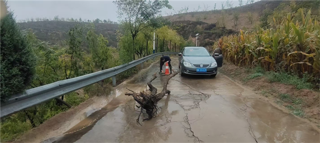 抢险同行,抢险一线党旗高扬。村道上,工作人员冒雨在倒伏树木旁设置警示锥,保障通行安全;滑坡路段,装载机轰鸣作业,快速清理堆积的泥土、石块,全力抢通“生命通道”。镇、村党员干部组成的排查队,深入窑洞民居、地质隐患点,逐户走访、逐项排查,对存在安全风险群众耐心劝离、妥善安置,严格落实“两把锁”制度,确保转移人员“零回流”。