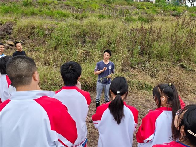 劳动实践基地化身为开放的“田野讲堂”。生物教师王自丙以田间作物为"活教材",深入浅出地讲解植物分类与生态竞争;地理教师曾文军引导学生观察地形地貌、触摸岩石样本,阐释流水侵蚀与土壤形成规律。书本上的知识在躬行实践中焕发出全新的活力,同学们围绕在老师身旁专注聆听,真切感受到如何将劳动教育与课程和学生实际生活的深度融合。