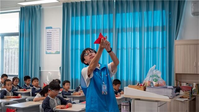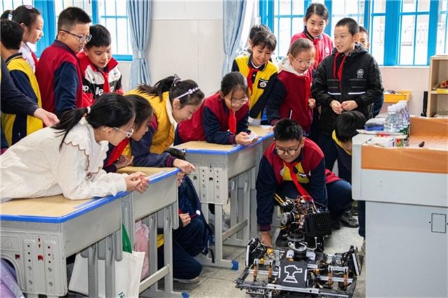 科学实验环节,“电磁小火车”惊艳登场,电池与磁铁在铜线圈轨道上催生动力,带动小火车自动穿行,孩子们惊呼连连、争相体验,在动手操作中触探科学奥秘,悄然埋下“勇于登攀”的科学火种。“我们希望用孩子听得懂、喜欢看的方式,把‘两弹一星’精神讲深、讲活。”宣讲团指导老师杜文星表示,“这不仅是一次科普,更是一堂行走的思政课,是爱国主义教育从娃娃抓起的有益实践。”