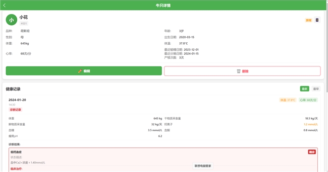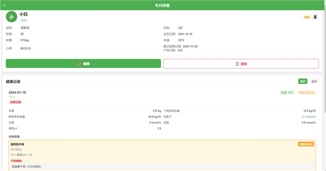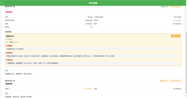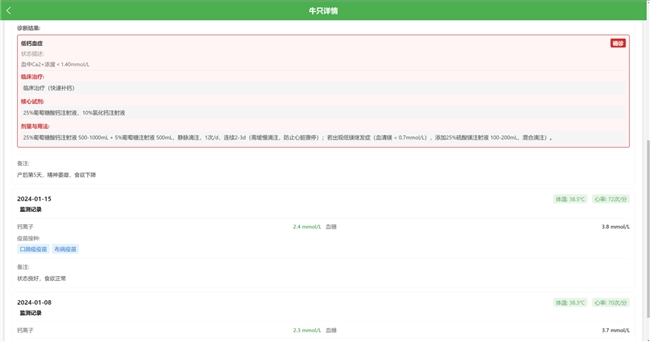 下图为小程序系统里的一份记录页面,属于养殖场景下的诊疗与监测类文档,主要包含病症处理方案和不同日期的健康数据记录,是辅助养殖管理的数字化台账,用来跟踪牲畜健康相关的干预与状态变化。