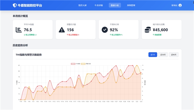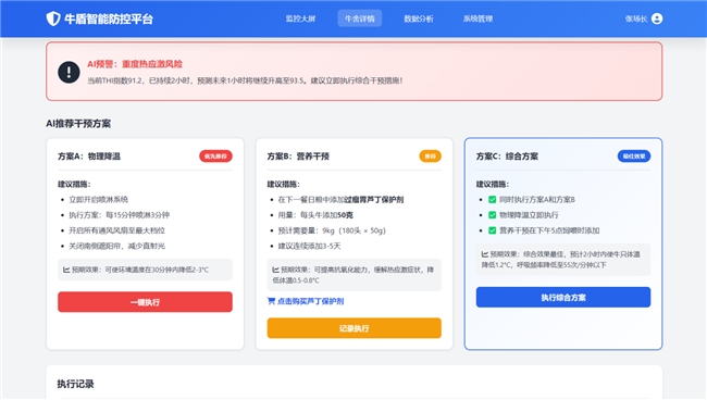 “牛盾智能防控平台”网站聚焦畜牧养殖场景的风险防控。界面显示系统监测到“重度热应激风险”,并推送了对应的AI干预方案,包含物理降温、营养干预及综合策略三类,各方案标注了具体措施、预期效果,还设有执行操作按钮。整体是数字化养殖管理工具的操作页面,体现了智能监测、自动预警、方案推荐的功能,帮助养殖者应对牲畜健康风险,是现代养殖领域智能化管理的体现,界面布局清晰,信息以预警、方案、操作为核心模块呈现。