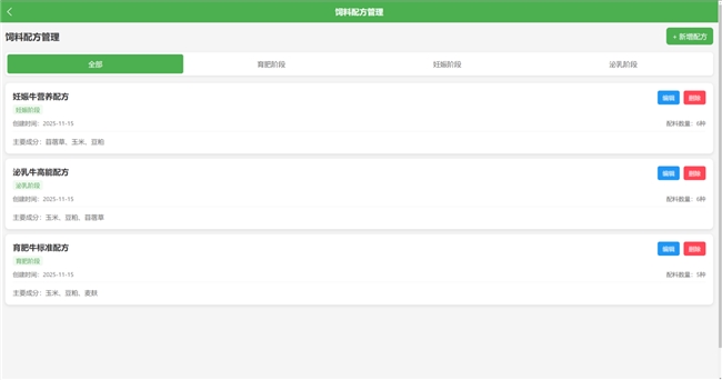 下图为“饲料配方管理”界面,属于养殖管理系统的功能模块,核心呈现不同养殖阶段(如妊娠牛、泌乳牛、育肥牛)的饲料配方,包含配方名称、主要成分及操作功能(新增、编辑等)。