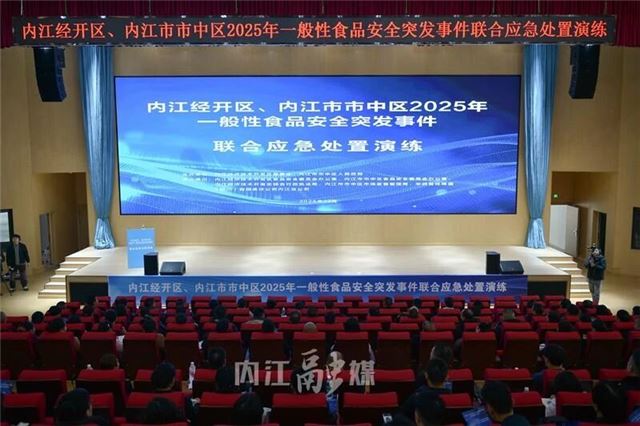 为进一步筑牢食品安全防线,提升跨区域、多部门协同处置食品安全突发事件的能力,12月18日,内江经开区管委会联合市中区人民政府,在内江六中经开区实验学校开展2025年一般性食品安全突发事件联合应急处置演练,两区食安委成员单位、食品生产经营主体及学校食堂相关负责人等200余人到场观摩。