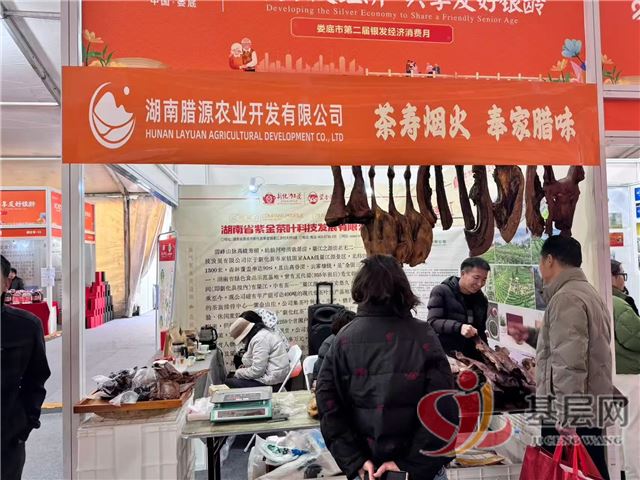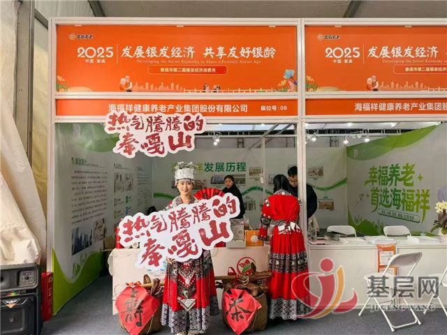 在展会现场,奉家镇的展位设计别具匠心。工作人员用当地常见的采茶竹背篓,层层叠叠搭建出“中国茶寿之乡”的字样,质朴又醒目,瞬间吸引了众多参展者驻足。展位通过易拉宝图文并茂地呈现了奉家镇的“国字号”名片:“民心茶室”基层治理模式入选全国党建引领基层治理典型案例,以及正在稳步建设的紫鹊界康养小镇。同时,蒙洱茶叶、湖南腊源的奉家腊味、紫金茶叶等本土特色产品现场陈列,工作人员通过随机采访与参观者互动,收集市场反馈,倾听银发消费群体的真实需求。