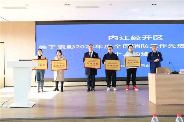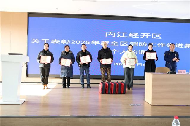会议最后宣读了2025年内江经开区消防安全先进集体和先进个人表扬通报,并为获奖代表颁发荣誉证书。