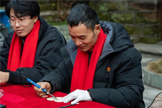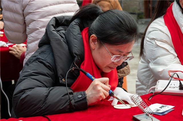 参观调研之后,流动党员们走进市中区非遗展览馆,亲自体验烙画制作技艺,感受家乡非遗文化的独特魅力。在烙画体验环节,流动党员们亲自执起电烙笔,在木板上细心勾勒,于实际操作中感受非遗技艺的温度与匠心。党员们纷纷表示,自己在亲手创作的过程中进一步增强了对家乡非遗文化的认同感与自豪感。
