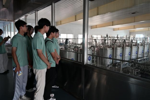 在完成养殖端服务后,实践服务团转向乳制品加工环节,按“先小型后大型”顺序走访乳企。来到青岛博宇牧业有限公司,实践成员在企业工作人员陪同下,走进生产车间,从原奶接收区到巴氏杀菌生产线,从均质净化设备到无菌包装车间,成员们近距离观察乳制品加工全流程,详细记录每一个环节的质量管控标准,直观感受科技如何让 “新鲜牛奶” 变身 “安全乳品”。