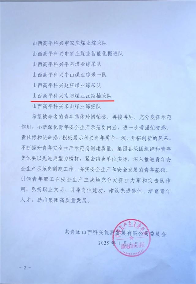 喜 讯 喜讯 根据共青团山西科兴能源发展有限公司委员会1号文《关于开展2024年度“青年安全生产示范岗”创建活动的通知》相关要求,1月4日,南阳煤业瓦斯抽采队被科兴集团团委命名2024年度集团青年安全生产示范岗。 瓦斯抽采队现有职工47人,40岁以下青年33人,平均年龄36岁,占比总人数70%。瓦斯抽采队积极贯彻“安全第一,预防为主,综合治理”方针,围绕“安全生产,青年当先”活动主题,激励引导广大青年员工强化安全生产意识,提高安全生产技能,在安全生产管理中充分发挥生力军、主力军作用,全面推动创建“青年安全生产示范岗”活动常态化、制度化、规范化和科学化,以此作为提升整体安全生产水平的重要抓手。 通过示范岗的建设,培养了一批懂安全、会操作、能管理的青年安全生产骨干,进而带动全体职工共同营造安全、和谐的工作环境。 下一步,瓦斯抽采队将继续坚持以习近平新时代中国特色社会主义思想为指导,深入贯彻落实习近平总书记关于安全生产的重要论述和重要指示批示精神,按照“青年安全生产示范岗”标准和要求,不断完善创建计划和措施,确保示范岗能够持续发挥示范引领作用,为公司高质量安全发展贡献青年力量。