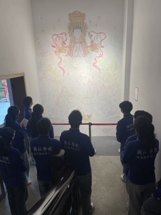 展馆内还绘有多幅墙绘作品,其中一幅以“一瓣香”的妈祖Q版形象为主题的墙绘深受研习社成员的关注与喜爱。孙子璇馆长向研习社成员介绍,这幅作品被她称作“还未完成的作品”,画中的场景是妈祖与千里眼、顺风耳在云端之上,和平的鸽子围绕着整幅画,底下是海上航行的船只。她表示,希望通过这幅画,传递出对和平统一的愿景,所有漂泊的孩子都能找到回家的路。