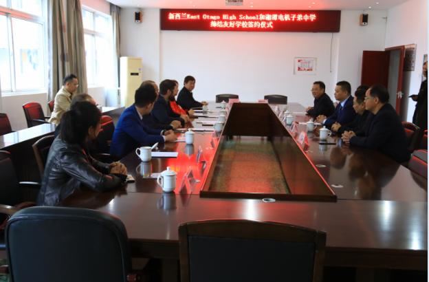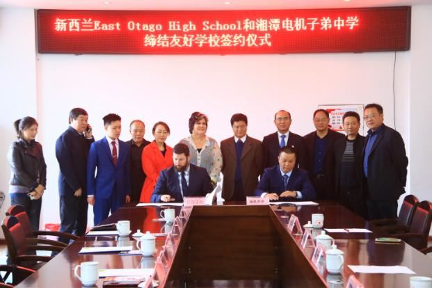 在到会的领导和嘉宾见证下,中国湖南省湘潭电机子弟中学与East Otago High School of New zealand,本着加强学校素质教育,提高教育水平,以及教育走向国际化的原则,由湘机中学校长谭丹、东奥塔哥高中校长Marcus共同签署了两校《关于素质教育的交流与发展合作备忘录》。