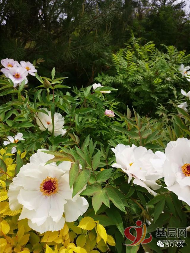牡丹花文/胡本全天香金蕊仙姿绽。碧叶花苞白露含。彩蝶穿梭蜂采蜜,艳招过客细寻探。