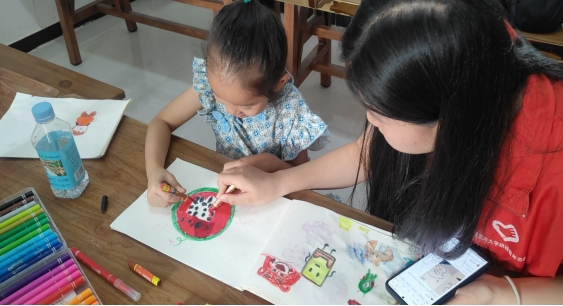 艺术课堂不止于此,更可与日常生活相结合--折扇文化。今天志愿者老师也为大家带来了传统的折扇,折扇不仅是一件手工,也象征着对色彩的理解与鉴赏,接下来就由同学们自由发挥自己的折扇其中有一位小朋友提出“我做的是西瓜折扇,不仅“解渴”,还能让我更凉快呢。”