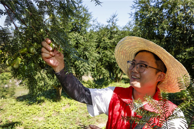 金秋送爽,榧果飘香。近日,浙江淳安枫树岭镇凤凰庙村群聚家庭农场的香榧基地上一颗颗饱满的香榧果缀满枝头,成熟开裂的青果也散发着迷人的清香,丰收的笑容洋溢在基地负责人廖龙建的脸上。