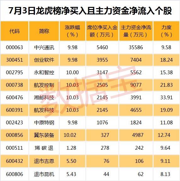 7月3日龙虎榜中机构及营业部席位资金净卖出10.22亿元,其中净买入的个股有13只;净卖出的个股有25只。净买入前三名个股分别是中兴通讯、创业软件、永和智控等,净买入金额占当日成交额比例达1.47%、9.74%、8.70%。
