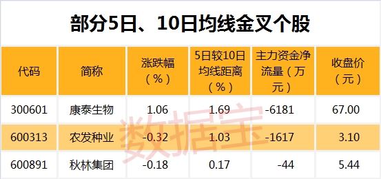 截至7月3日收盘,有3只A股的5日均线主动上穿10日均线,其中康泰生物、农发种业、秋林集团等个股的5日均线较10日均线距离最大,分别达1.69%、1.03%、0.17%。