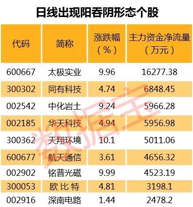 截至5月29日收盘,两市共有47只个股日K线出现阳吞阴形态,当天涨幅最大的是天翔环境、铭普光磁、太极实业,涨幅分别为10.1%、9.99%、9.96%。