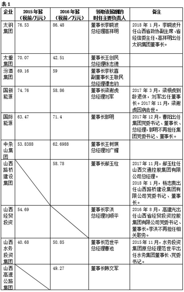 2016年,上述二人税前报酬各自达到86.48万元,连续两年在山西省属国企老总中名列前茅。