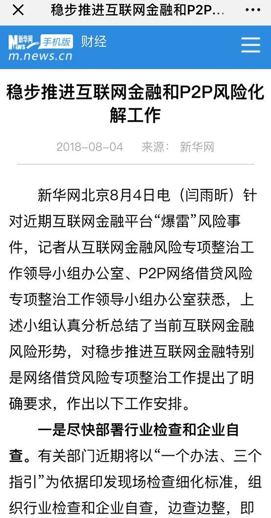 针对近期互联网金融平台“爆雷”风险事件,互联网金融风险专项整治工作领导小组办公室、P2P网络借贷风险专项整治工作领导小组办公室认真分析总结了当前互联网金融风险形势,对稳步推进互联网金融特别是网络借贷风险专项整治工作提出了明确要求。