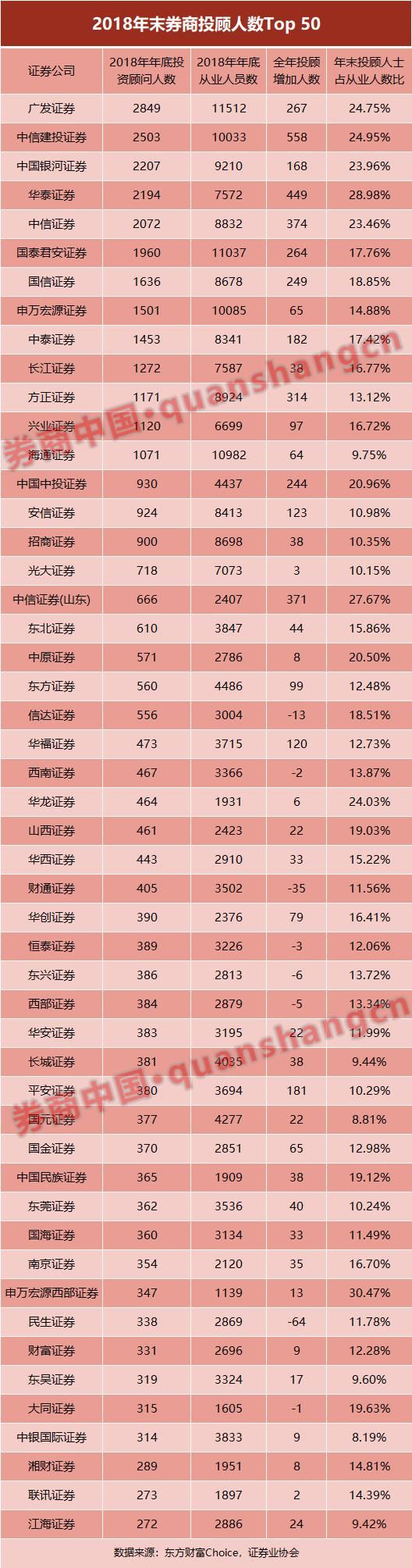 2018年,券业整体裁员是既定事实,但投顾人数净增近5000人,增幅超13%。作为财富管理的三大核心要素之一,多家券商都在发力投顾建设,中信建投、华泰证券、中信证券等多家券商去年投顾人数都有明显增加。