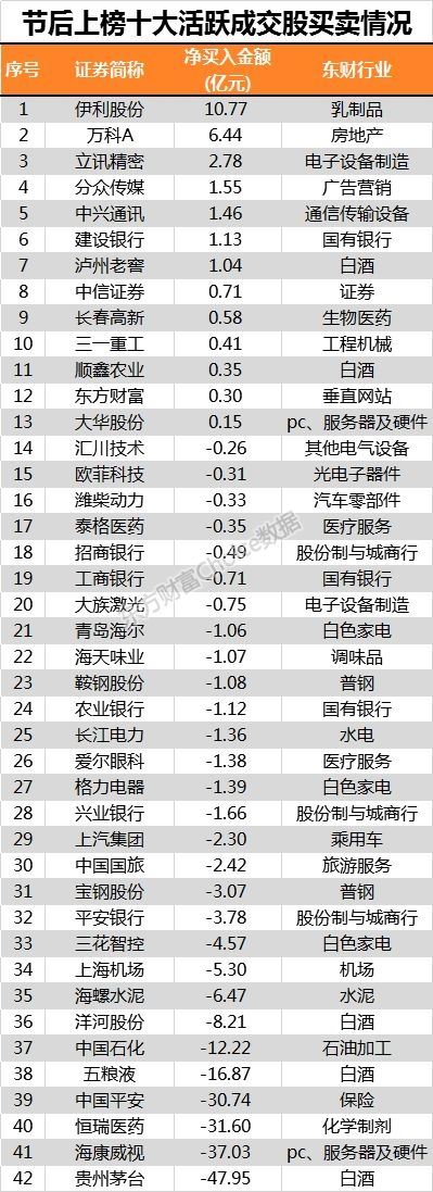 从陆股通十大活跃成交股来看,国庆节后共有42只个股上榜,其中29只个股被净卖出,占比69%。