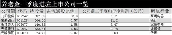 从目前最新披露的三季报数据来看,养老金账户在三季度大举杀入了九阳股份、常熟银行、浙江美大、天源迪科和元隆雅图等5家公司,进入这些公司的前10大流通股东之列。