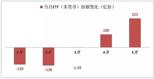 不过,此后A股突然迎来调整再度吸引大量资金回流ETF。统计显示(见下图),4月份,ETF总份额净增加100亿份,5月份这一份额继续猛增约222亿份。