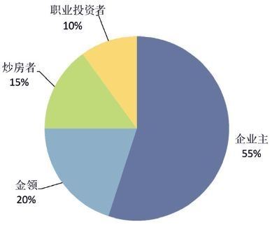 在千万元资产的高净值人群中,55%为企业主,其企业资产占其所有资产的60%;炒房者15%,房产投资占其总财富的90%;金领则占20%,他们的财富中现金及有价证券占20%;从事股票、期货等金融投资的专业人士占10%,其30%的财富为现金及股票,如图5所示。