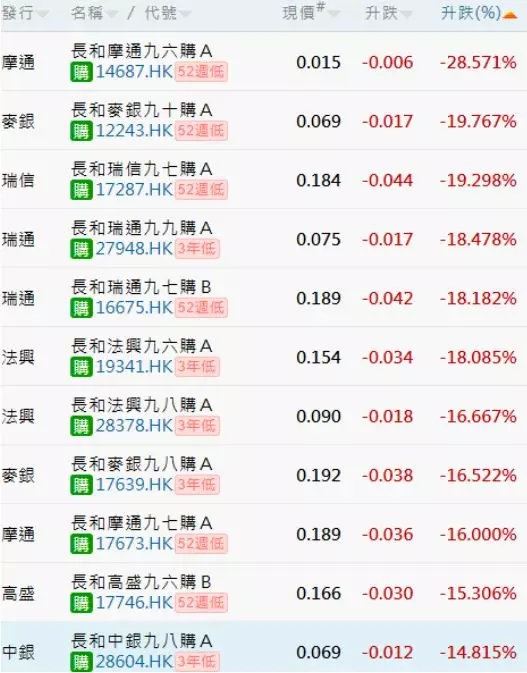 长和正股价格早盘一度以78港元价格低开,但随后有多头介入,全天以78.8港元收报,下跌1.19%。过去一年多时间,长和已经下跌近25%。长和认购证14日更是迎来集体暴跌,跌幅皆在14%以上,跌幅最大的长和摩通九六购A杀跌28.57%。