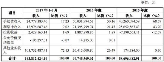 公司2017年1-6月中原期货营业收入主要为手续费收入、利息净收入和其他业务收入,其中上半年手续费收入2477.94万元,占比17.23%;利息净收入1297.67万元,占比9.02%;其他业务收入1.0373亿元,占比72.13%。