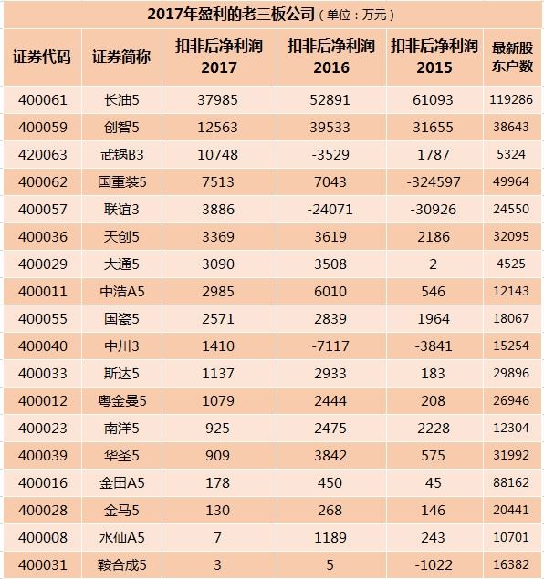 据论坛君统计,目前老三板59家企业中,能够正常披露年度报告及季度报告的企业共38家,截至4月27日,其中有33家公司披露了2017年年度报告,其中有18家公司实现盈利(以扣非后净利润为准)。