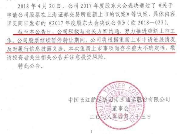 2014年,原长航油运因连续亏损而退市,成为当时“央企退市第一股”,退市后不久,在老三板挂牌的长油5就开始进行重整,并于当年实现盈利。